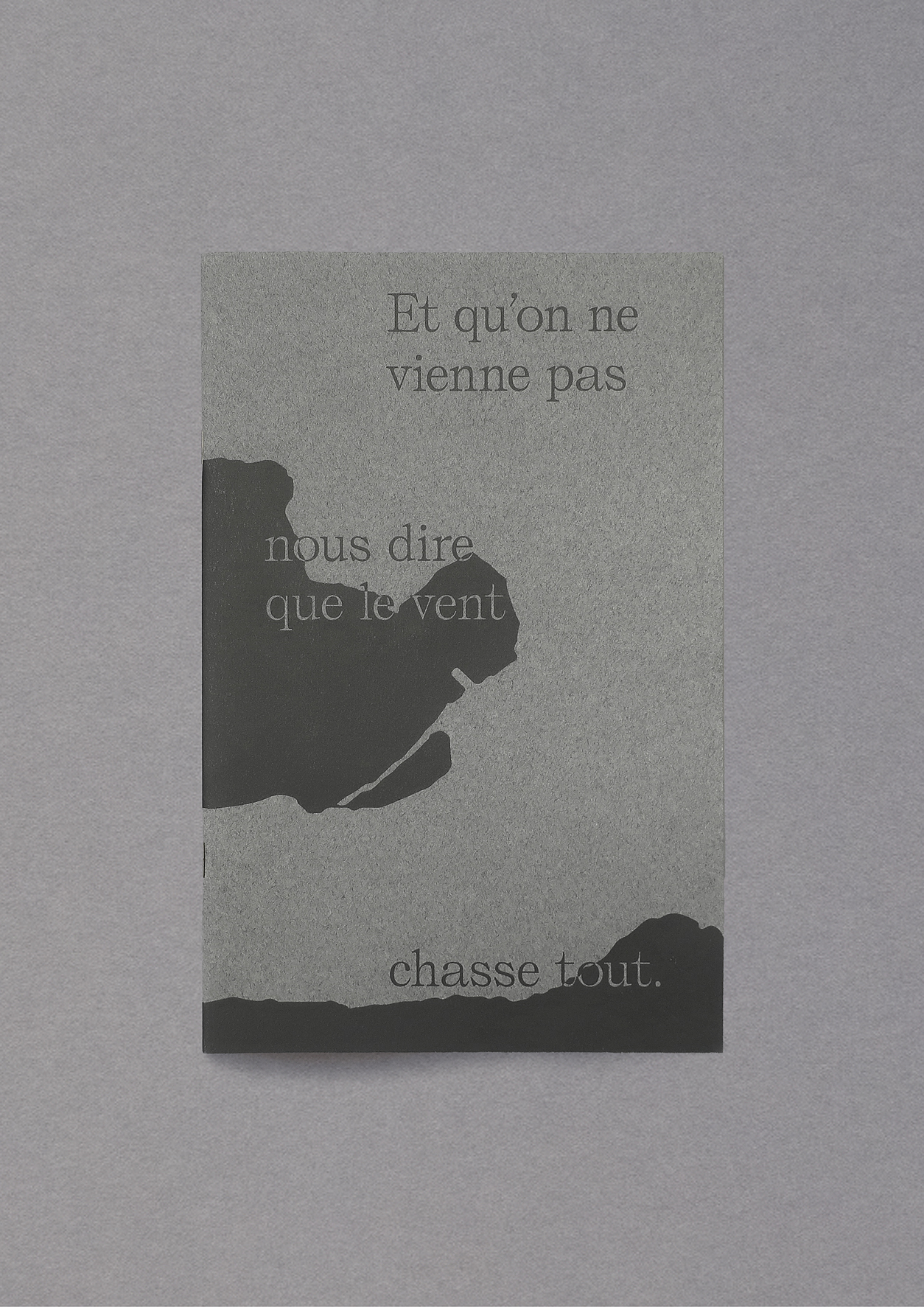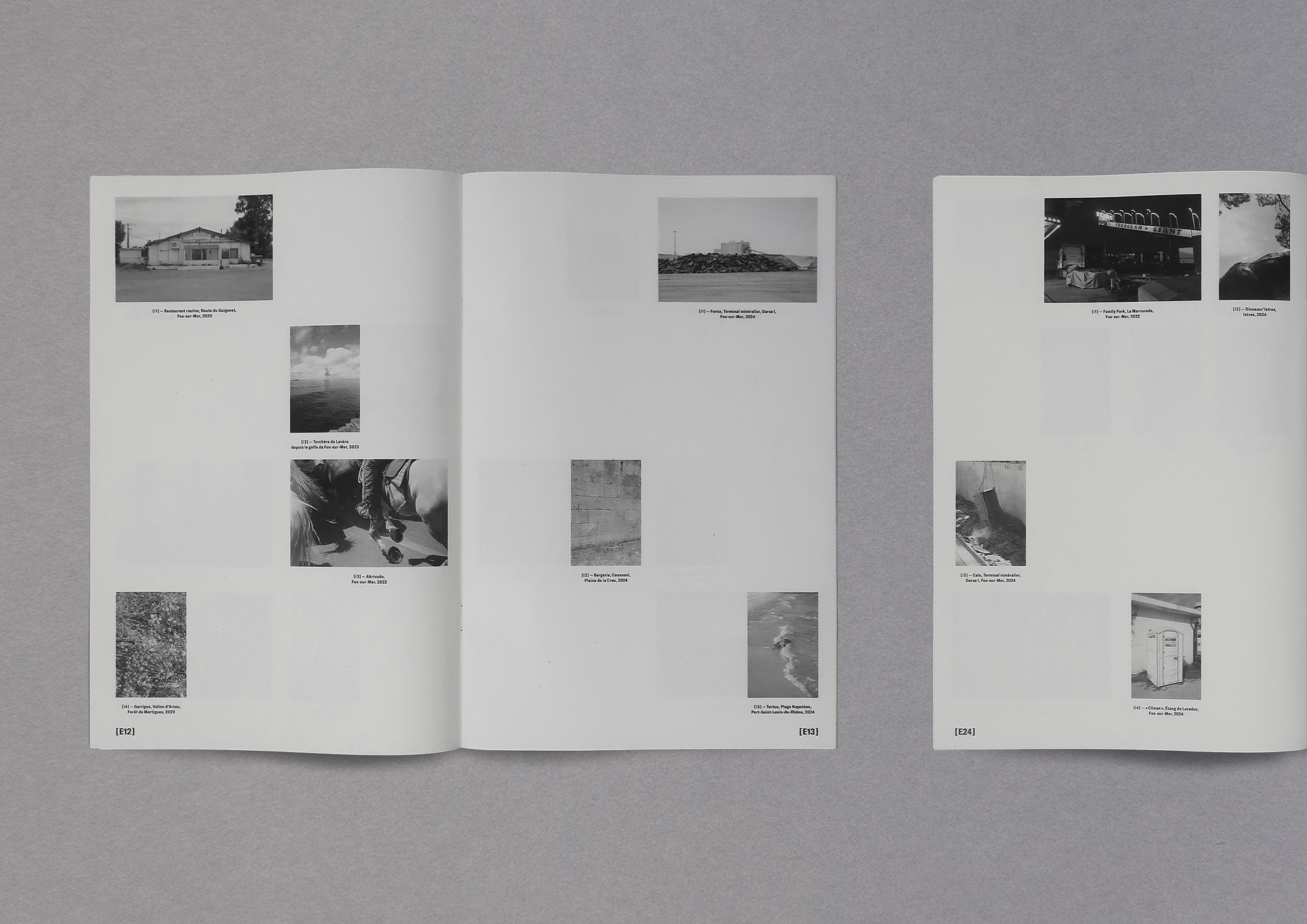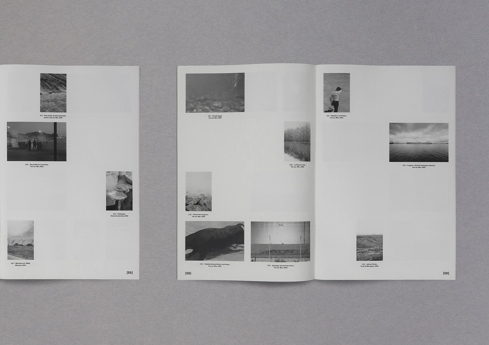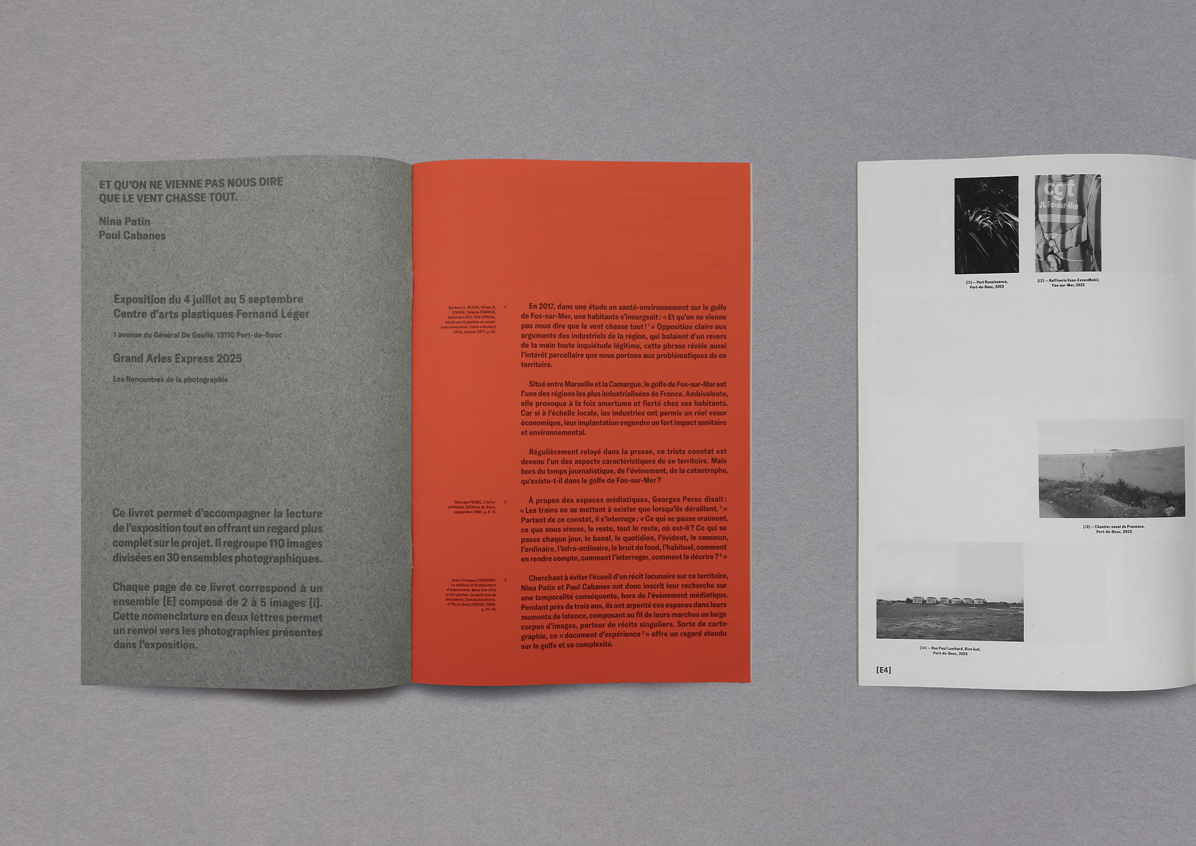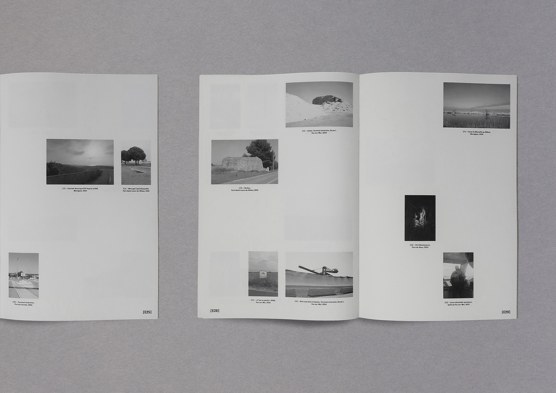 Conçu pour l’exposition « Et qu’on ne vienne pas nous dire que le vent chasse tout », ce livret permet d’en accompagner la lecture tout en offrant un regard complet sur le corpus photographique réalisé dans le golfe de Fos-sur-Mer. Il regroupe 110 images divisées en 30 ensembles photographiques, soit 30 propositions de récits sur ce territoire. Chaque page de ce livret correspond à un ensemble [E] composé de 2 à 5 images [i]. Cette nomenclature en deux lettres permet un renvoi vers les photographies présentes dans l’exposition.