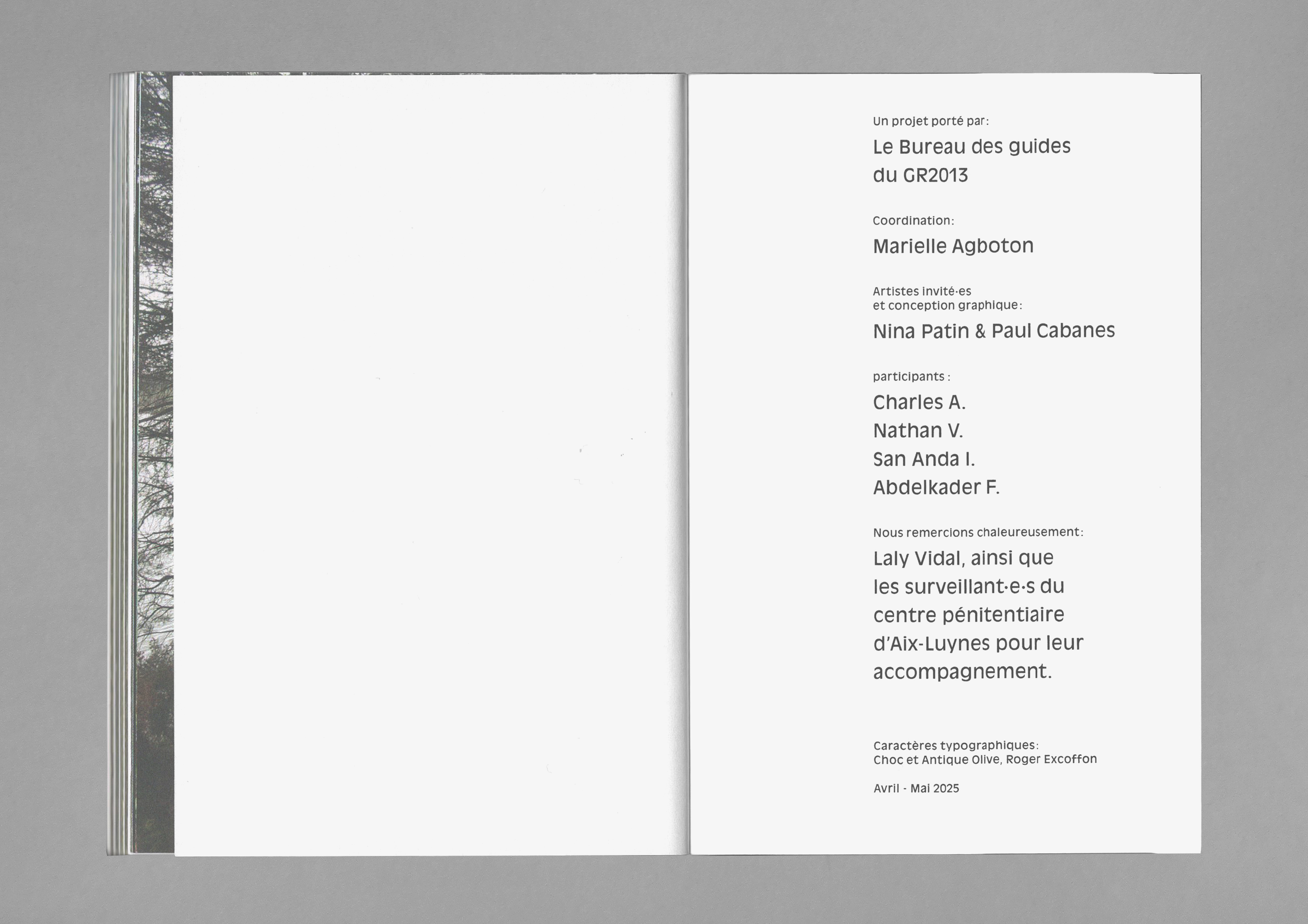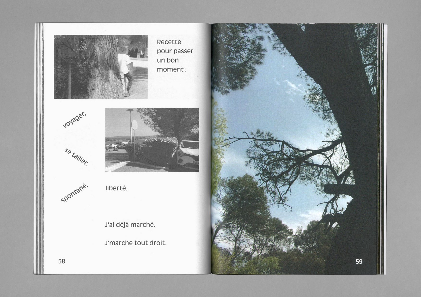 La mise en commun des images et des textes réalisés lors de la marche, le choix de la mise en page, du titre et des typographies ont, lors du dernier atelier, permis de retranscrire la temporalité narrative de cette expérience collective.