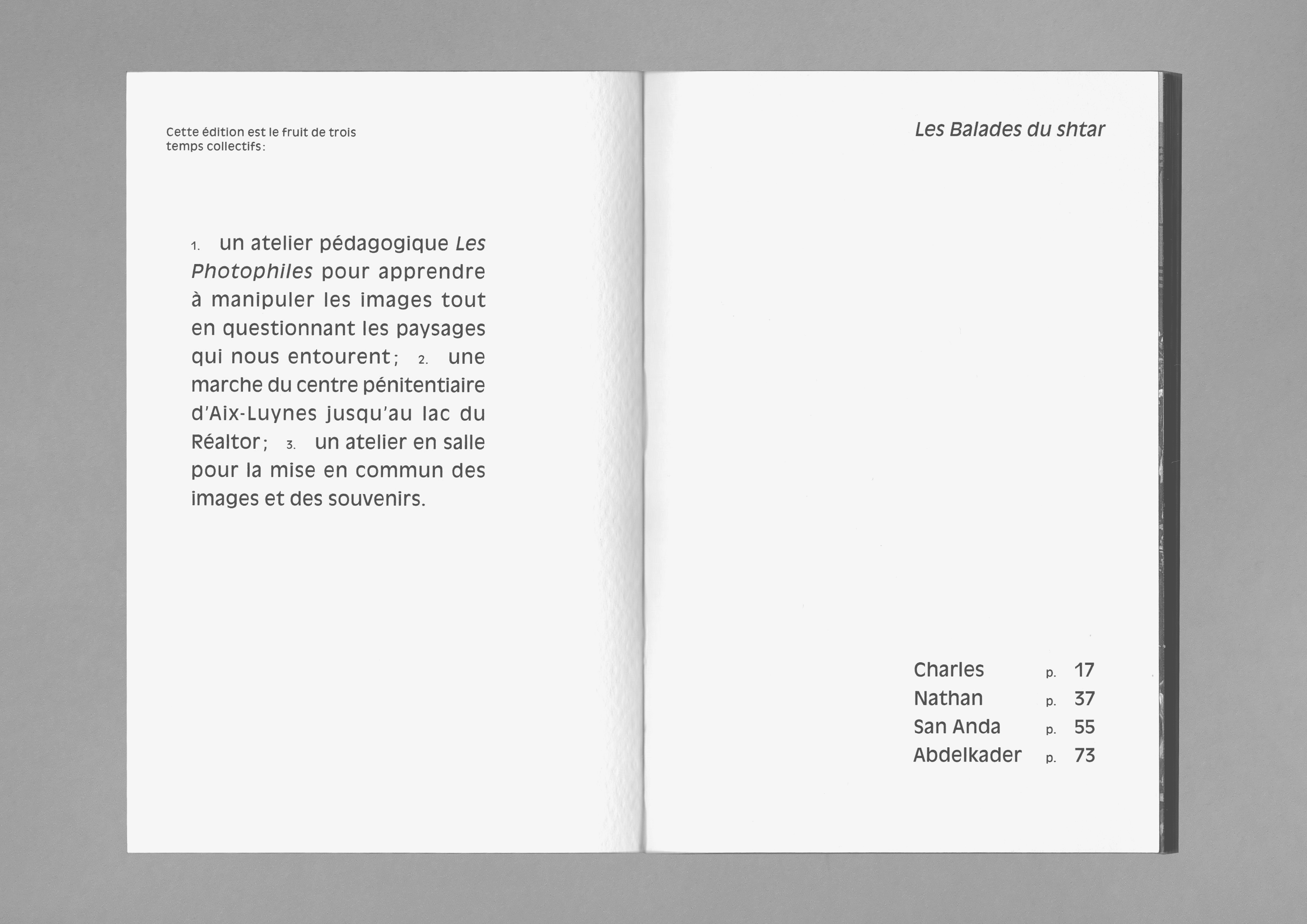« Les Balades du shtar » est un projet éditorial conçu avec quatre détenus du centre pénitentiaire d'Aix-Luynes, dans le cadre du programme « Les Photophiles » initié par le Bureau des guides. Au gré de trois ateliers, Charles, Nathan, San Anda et Abdelkader ont pu poser leurs regards sur les paysages de la région Aix-Marseille.