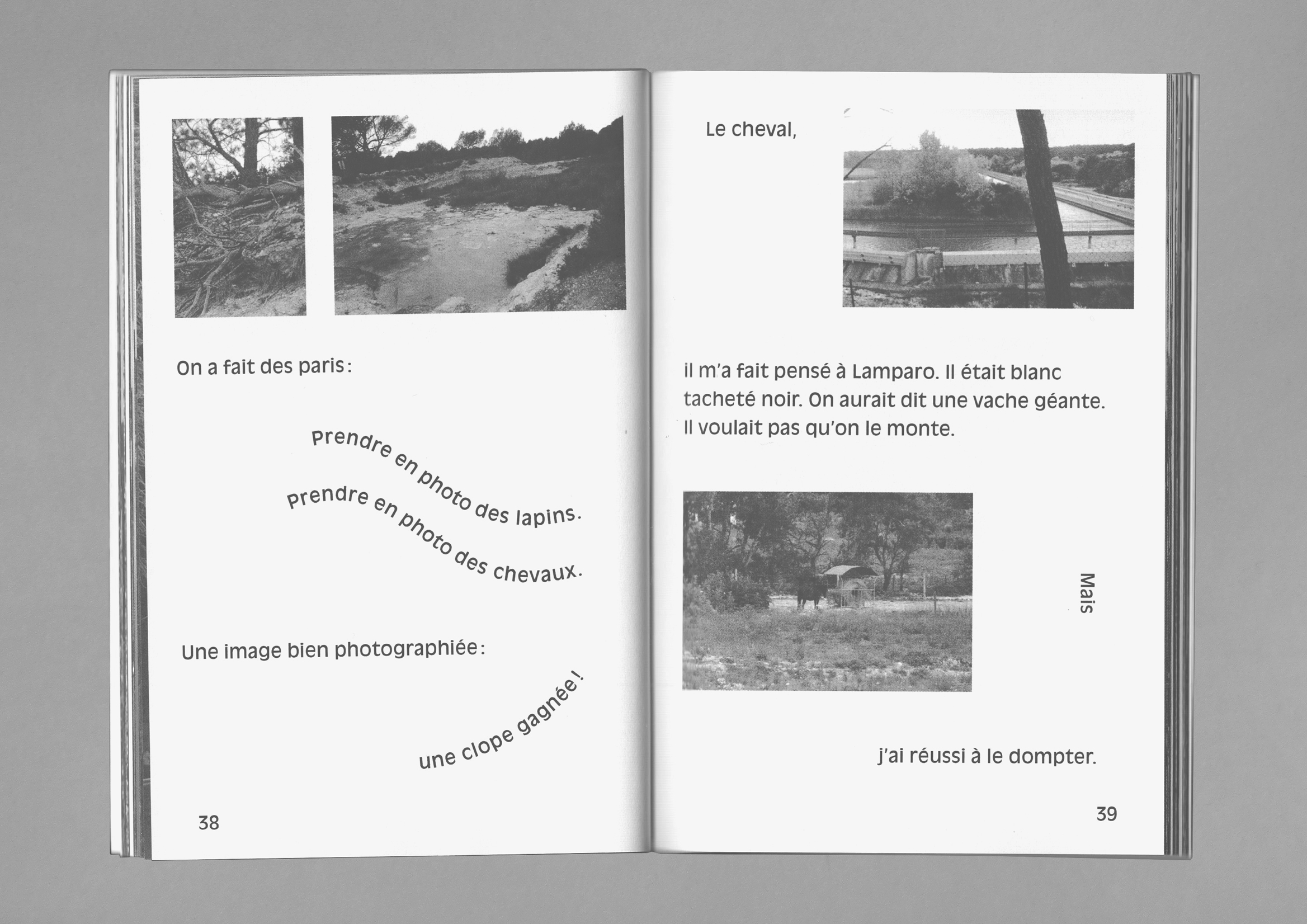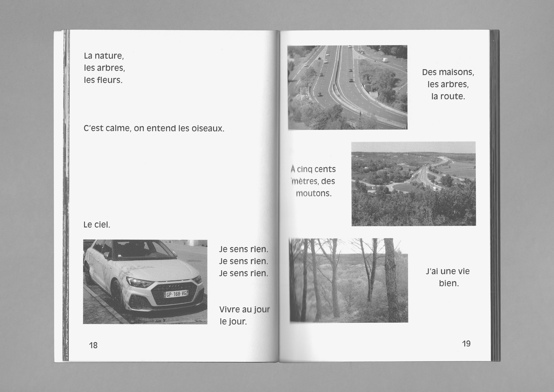 Ce livre est un recueil de photos et d’articles de presse, découpés, caviardés puis réagencés. C’est un récit construit de manière morcelée où le texte et l’image viennent s’entrechoquer, dialoguer et nous raconter une fiction faite d’éléments bien réels. C’est l’histoire de deux jeunes, d’un vol de voiture, d’une virée à travers l’Alsace… Au-delà de son récit, cet ouvrage, par son procédé d’écriture, nous interroge sur la presse et notre rapport au sensationnalisme. Dans le charivari informationnel de notre époque, l’image et le texte, affranchis de toute règle, deviennent des outils narratifs redoutables.